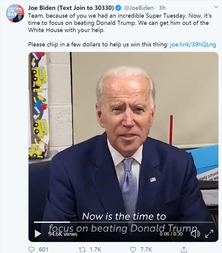 在选情逐渐明朗之际,拜登发布推特庆祝,并表明接下来将专注于击败特朗普,在各位支持者的帮助下决心将「特朗普赶出白宫」。