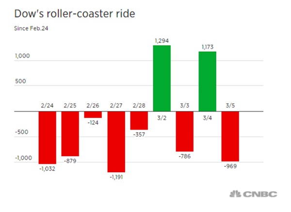 本周(3月2日至3月5日)以来,美股出现了剧烈震荡,走出“过山车”行情。四个交易日中,道指两次上涨超过1100点,周一收高1293点,创史上最大单日上涨点数;周三上涨超过1170点,录得史上第二大单日上涨点数。周二与周四则分别下跌了788点和969点。