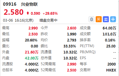 华盛资讯3月6日讯,兴业物联暗盘高开34.67%,最高涨50%,截至16:16报价2.58港元,较发行价涨29.65%,最新成交额181万港元,总市值为10.32亿港元。