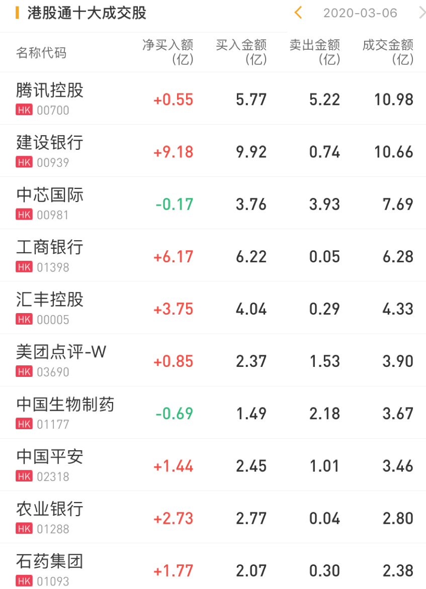 今日净买入建设银行9.18亿港元,净买入汇丰控股3.75亿港元,净买入工商银行6.17亿港元,净买入腾讯控股0.55亿港元。