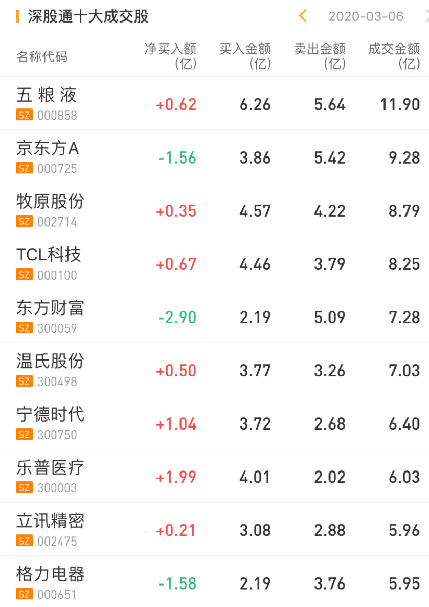 深股通净买入五粮液0.62亿元,净买入宁德时代1.04亿元,净买入牧原股份0.35亿元。