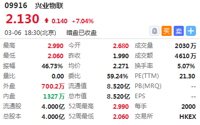 华盛资讯3月6日讯,兴业物联收盘涨7.04%,最新总市值8.52亿港元,成交额4610万港元,若按收盘价卖出不计手续费一手赚280港元。