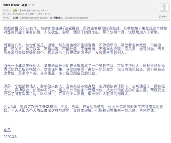 新氧科技董事长兼CEO金星也在内部邮件中证实了这一消息。金星在内部信中表示:“我们要感谢逍对公司的宝贵贡献。并祝愿她在今后的事业中一切顺利。”