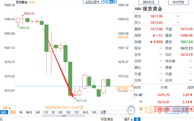 北京时间周五(3月6日)21:30,美国劳工部公布2月非农就业报告,表现大幅好于预期。截至发稿,现货黄金短线重挫逾14美元至1671.38美元/盎司,美元指数快速反弹近17点至96.048。