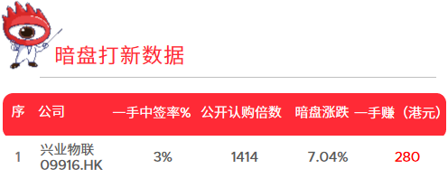 周五兴业物联的配售结果让人心情激动,超购1414倍?去年的新石文化1200倍左右,后来可是暗盘涨了80%!这次怎么也得涨到4块吧?