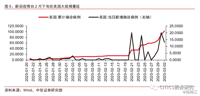 制造业和非制造业PMI表现分化,制造业PMI低于预期,新冠疫情对全球供应链的冲击可能在一定程度上阻碍制造业的上行趋势。美国2月份非制造业PMI远超预期,这也与2月份服务业就业数据表现强势相一致。虽然制造业就业数据扭转了此前两个月的负增长态势,有所回升,但是制造业PMI低于预期,制造业仍隐含风险。新冠疫情可能对全球范围内产业链造成冲击,导致装运延误、新订单减少,生产活动受损产生的影响通过产业链的方式向外传导,可能在一定程度上阻碍制造业的上行趋势。