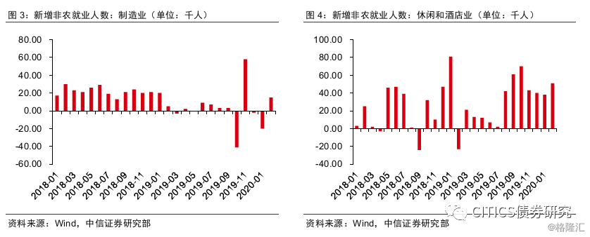 2月非农数据的增长主要由服务业和建筑业所贡献,制造业三个月来首次走高,疫情对服务业的冲击没有及时体现在就业数据之中。服务业中,医疗保健和社会救助业新增就业人数5.65万人,过去12个月累计新增就业人数53.41万人;休闲和酒店业新增就业人数5.1万人,前值3.8万人,过去12个月累计增加32.6万人;专业和商业服务业新增就业人数4.1万人,过去12个月累计新增就业人数40.2万人;金融业新增2.6万人,过去12个月累计增加14.8万人。由于新冠疫情自2月下旬开始在美国出现较大规模的蔓延,因此疫情对服务业的冲击没有及时体现在2月就业数据之中。建筑业新增就业人数4.2万人,大部分增长来自于专业贸易承包商;制造业新增就业人数1.5万人,自去年12月以来首次走高,逆转下行趋势。
