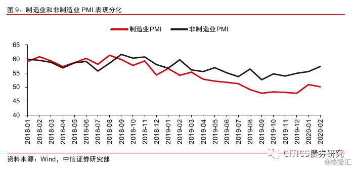 制造业和非制造业PMI表现分化,非制造业PMI远超预期,与服务业就业数据表现一致;制造业PMI低于预期,新冠疫情对全球供应链的冲击可能在一定程度上阻碍制造业的上行趋势。2020年2月份美国ISM制造业PMI为50.1,预期50.5,前值50.9,制造业PMI低于预期;非制造业PMI为57.3,预期54.9,前值55.5,非制造业PMI远超预期,这也与2月份服务业就业数据表现强势相一致。虽然制造业就业数据扭转了此前两个月的负增长态势,有所回升,但是制造业PMI低于预期,制造业仍隐含风险。新冠疫情可能对全球范围内产业链造成冲击,导致装运延误、新订单减少,生产活动受损产生的影响通过产业链的方式向外传导,可能在一定程度上阻碍制造业的上行趋势。