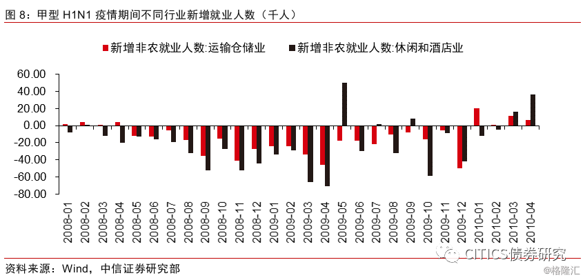 综合疫情的冲击及美国当前经济周期,当前企业投资意愿不高,疫情的蔓延对产业链的冲击叠加目前的经济走势,预计3月非农就业,尤其是服务业就业数据大概率承压。3月3日,鲍威尔在美联储紧急降息声明中称,新冠病毒的蔓延将会对美国国内及国际经济活动带来压力,美国经济前景面临的风险已经发生了实质性的变化。我们认为,新冠疫情虽然在2月非农数据中没有得到完全的体现,但是疫情的大规模蔓延叠加目前经济周期,预计对服务业及产业链造成较大的冲击。回顾2009年4月中旬至2010年4月在美国本土蔓延的甲型H1N1疫情期间非农就业数据,受到次贷危机后经济滑坡的影响,整体非农就业数据表现惨淡,2009年4月,非农就业人数减少69.5万人,延续此前下降态势,失业率升至9%。服务业方面,2009年4月至10月服务业就业人数维持负增长,4月份休闲和酒店业、运输仓储业分别减少7.1万人、4.57万人。由于甲型H1N1流感传染性和致死率相对来说没有达到此次疫情的严重程度,虽然被世界卫生组织认定为“国际关注的突发公共卫生事件”(PHEIC),但其对经济和就业的冲击较经济危机来说更轻。因此,疫情对非农就业的影响更要结合当前美国经济周期来看,美国当前企业投资意愿不高,经济上行动力不足;同时此次新冠疫情从蔓延速度和致死率方面均比甲型H1N1疫情更为严重,对休闲和酒店业、运输业的冲击可能更强。考虑疫情对产业链的冲击叠加目前的经济走势,预计3月非农就业,尤其是服务业就业数据大概率承压。