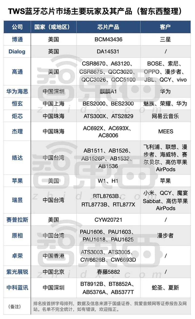 TWS蓝牙芯片市场的部分主要玩家