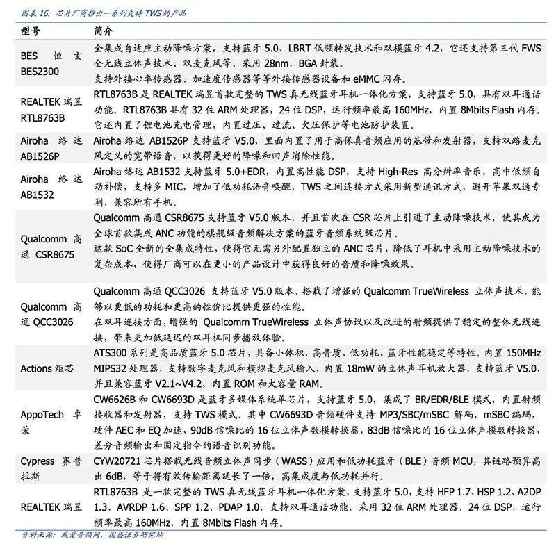 据国盛证券2019年市场研究报告数据,截止2019年4月,全球已有包括高通、络达、瑞昱、恒玄和炬芯等在内的8大芯片厂商,共推出了18款TWS蓝牙芯片解决方案。