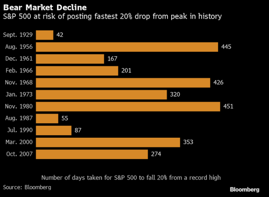 倘若在4月1日之前完成20%的下跌,那将是史上以最快速度从纪录高位跌入熊市。在1929年大萧条时期,牛市的终结用了42天。