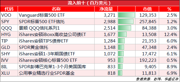 上周净流入最多的十大ETF中,不乏避险类ETF,比如黄金信托GLD,净流入11亿美元,SHY、BIL这样的短期国债产品分别流入11亿美元、8.3亿美元。相对抗跌的公用事业类基金XLU也录得8.2亿美元资金追捧。