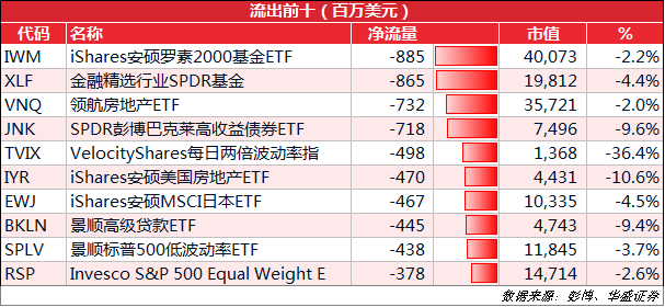 在净流出方面,追踪罗素2000指数的IWM和金融精选行业基金XLF首当其冲,分别流出近9亿美元。而新兴市场基金EEM、日本市场基金EWJ的净流出也在预料之中,它们直接受到疫情影响,受到的冲击也相对更大。