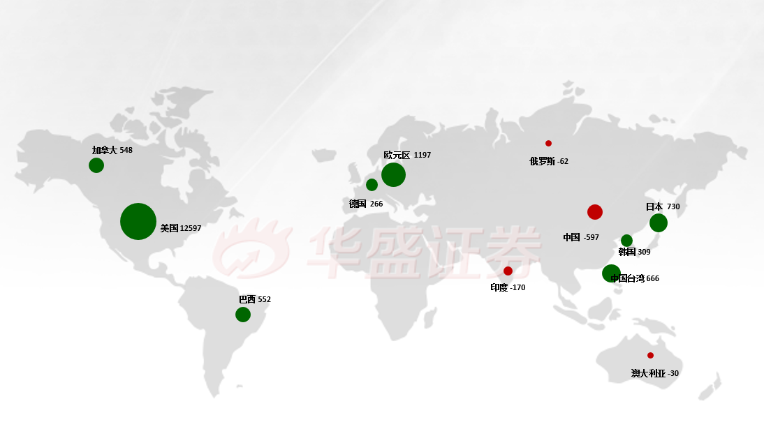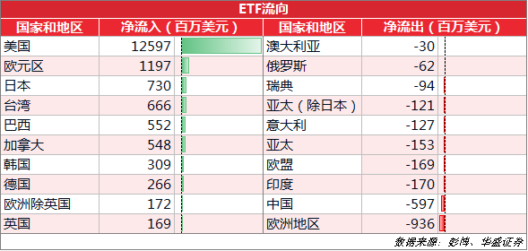 在国家和地区角度,美国市场继前一周净流出240亿美元垫底之后,再次回到“最吸金”市场宝座,上周净流入126亿美元。此前流出严重的日韩等市场也呈现回暖,加拿大、巴西连续出现资金净流入。