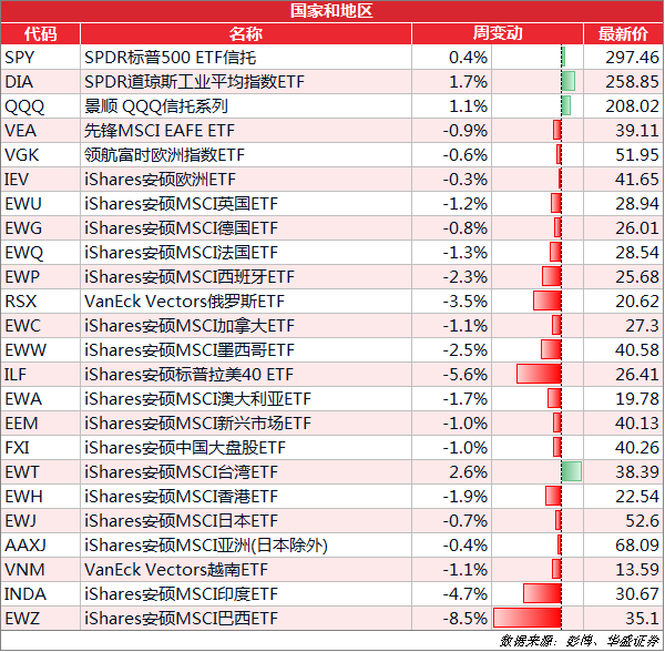 上周美股三大指数ETF历经大涨大跌,最终录得轻微上涨,除此以外,仅有追踪台湾市场的EWT呈现上涨。
