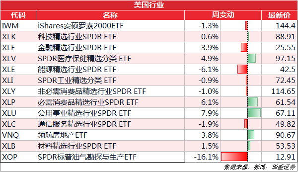 行业方面,医疗保健、必须消费品、公用事业及房地产相对抗跌,都有4-8个点的涨幅。跌幅最大的则是油气、能源类ETF。