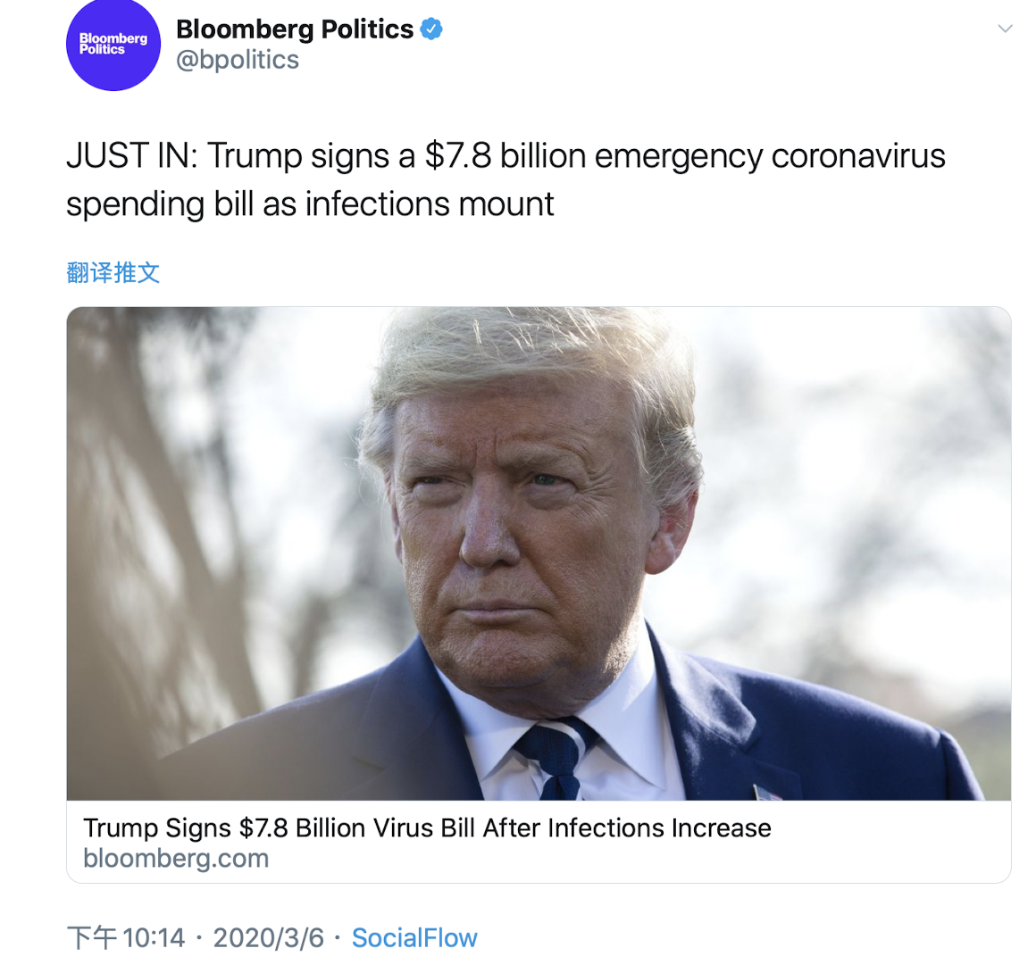 据彭博社上周五消息,美国总统特朗普签署了一份78亿美元的新冠病毒疫情紧急支出法案。这项支出法案由特朗普于当地时间3月6日签署。法案提供的资金远远超过特朗普最初要求的25亿美元。议员们曾称,他们预计国会批准更多的紧急支出资金,才能使新冠病毒疫情得到平息。