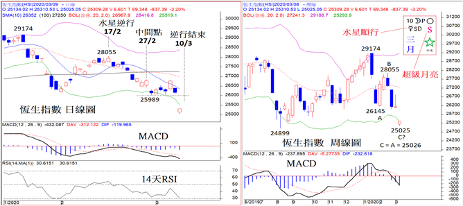 受到上述利淡消息所帶動,恆生指數今早裂口低開逾千點,最低跌至25025,跌幅之後才逐步收窄,重上25200點的水平。值得一提的是,恆生指數是次跌浪的起點為2月17日的28055,當日剛好就是水星開始「逆行」的日子,而明天(3月10日)將會是周期結束的日期,其正負一個交易日內都可能是轉向的時間窗。事實上,明天除了是「水星逆行」結束的日子之外,亦會發生「超級月亮」的天文現象,所以有機會產生明顯的轉向作用。