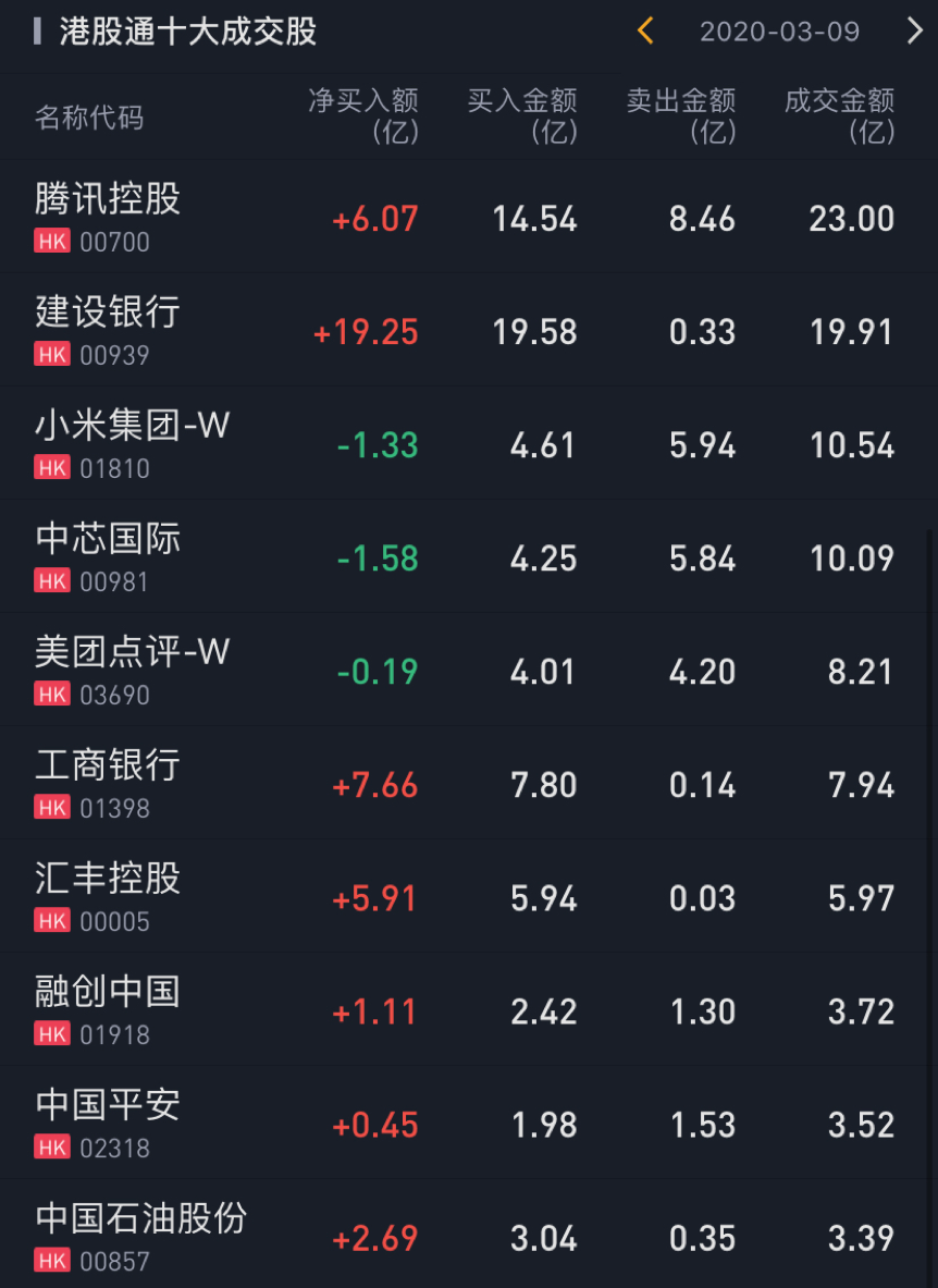 今日净买入腾讯控股6.07亿港元,净买入建设银行19.25亿港元,净买入工商银行7.66亿港元,净卖出小米集团1.33亿港元。