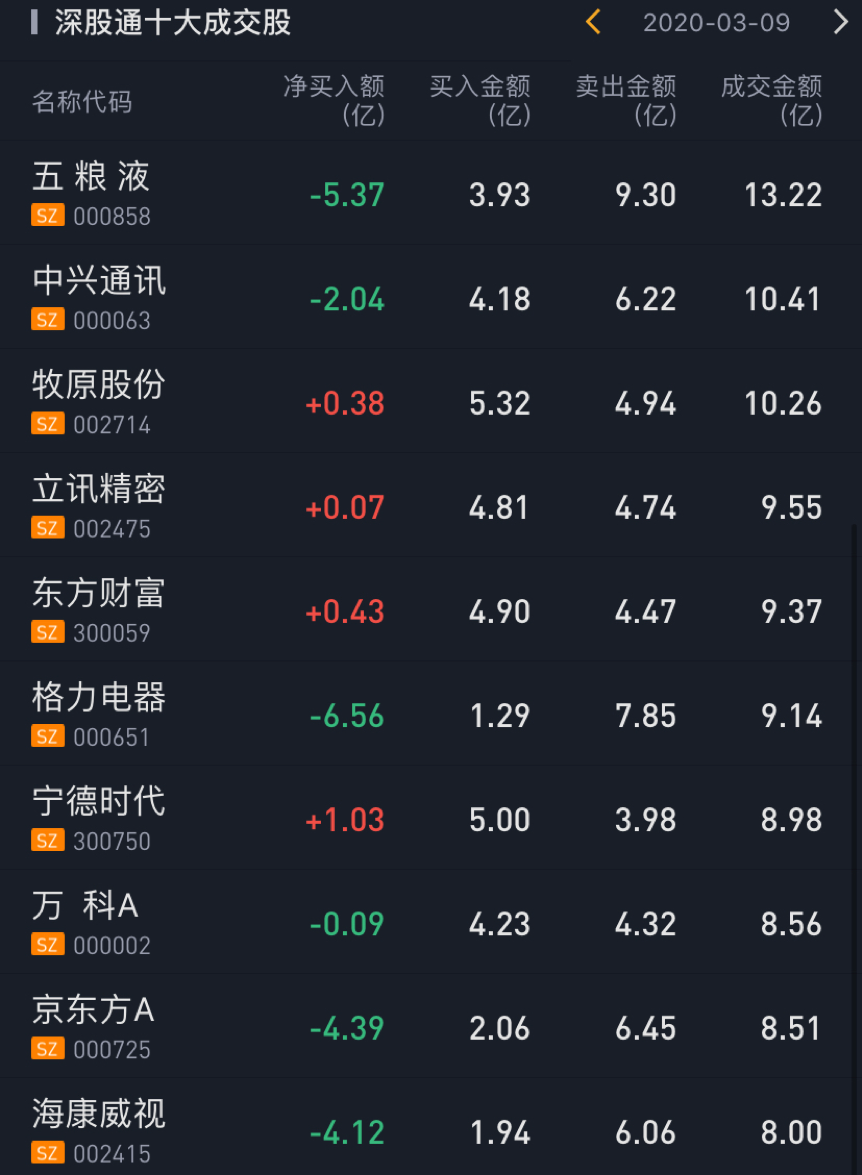 深股通净卖出五粮液5.37亿元,净卖出中兴通讯2.04亿元,净卖出格力电器6.56亿元。