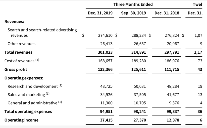 与搜索相关业务仍是财报收入中的最大占比,约91.2%。具体来看,其在2019年第四季度数字为2.746亿美元,同比下降1%,环比下跌4.72%。与此同时,基于拍卖的付费点击服务同比增长,占搜索和搜索市场的88.2%。