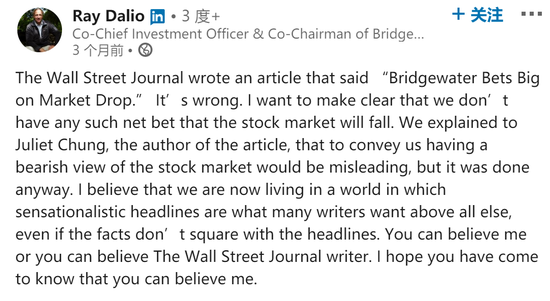 (达里奥:《华尔街日报》说桥水看空后市是错误的报道,来源:社交媒体)