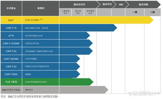 但这仍然掩盖不了市场规模小的现状。智通财经注意到,目前中国正在进行临床试验的11款细胞免疫治疗产品中,10款为CAR-T细胞产品,另外一款为AAL产品,也即EAL®所属类别。这两种产品针对不同类型的癌症有疗效,EAL®也是目前国内走在前列的相关产品。