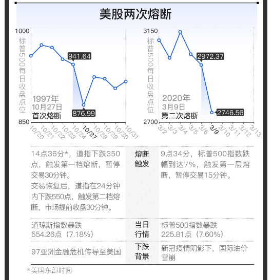 中国股民对2016年开年试行“熔断”规则,带来两天熔断四次的股灾,应该还有疼痛记忆。在这一次的美股股灾中,恐慌性抛售中又导致了熔断。这是美国股市引入熔断机制以来的第二次,也是熔断机制调整为现行规则后的第一次。熔断到底是怎么回事,我们今天就来详细了解一下。