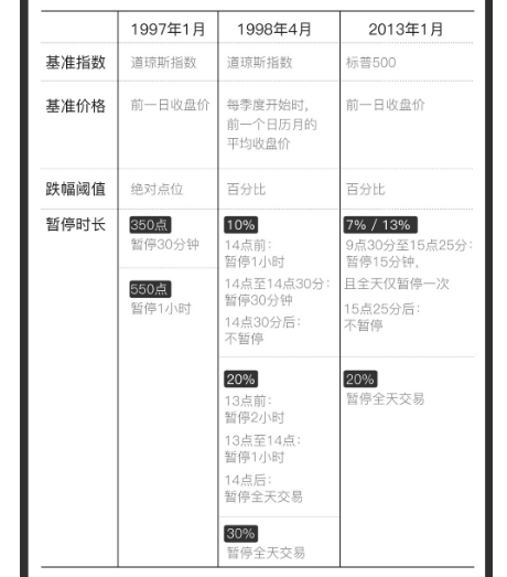 鉴于熔断机制在2008-2009年“次贷”危机中“呆若木鸡”,毫无反应,2012年5月31日,纽交所再一次,也是迄今最新一次修改熔断机制。一是用标普500指数取代道琼斯指数作为熔断基准指数,二是将原先只有一档(最初为7%,后改为10%)的熔断阈值改为三档,即7%、13%和20%,新的熔断机制自2013年2月4日起生效,三是取消“平均值机制”,重新恢复最初的“前一日收盘价机制”。
