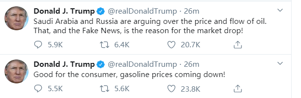 特朗普先是表示之前被普遍认为导致股市下跌的沙特压低油价的事件,对消费者来说是件“好事”;之后他又说是沙特和俄罗斯在为了油价打架,还有假新闻的炒作,才是导致股市下跌的原因。