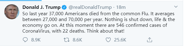 他发的第三个帖子是关于新冠病毒的,他说:“所以去年3.7万美国人死于普通感冒。平均每年有2.7万到7万人。没有任何东西被关闭,生活和经济都在继续。此时此刻新冠病毒的确诊病例是546个,22个死亡。想想吧!”