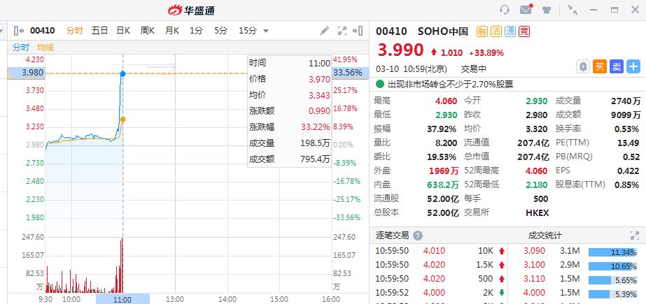 据市场消息,黑石集团正与SOHO中国就后者私有化进行谈判,交易价值40亿美元。知情人士称,黑石集团(BX.N)向SOHO中国提出的私有化报价为每股6港元(较该股现时股价高约一倍)。截至发稿,soho中国飙升33.89%。