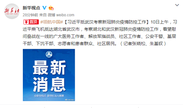 10日上午,习近平乘飞机抵达湖北省武汉市,考察湖北和武汉新冠肺炎疫情防控工作,看望慰问奋战在一线的广大医务工作者、解放军指战员、社区工作者、公安干警、基层干部、下沉干部、志愿者和患者群众、社区居民。(记者张晓松、朱基钗)