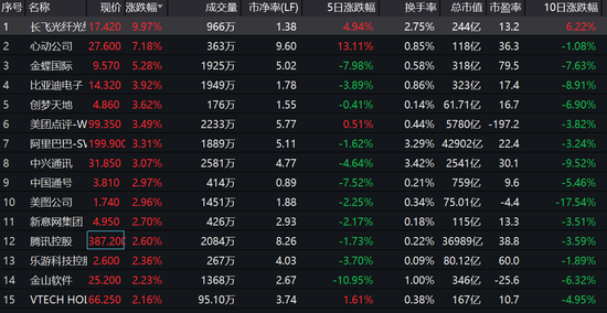 3月10日消息,科技股集体走高。其中,长飞光纤光缆涨10%,心动公司涨7%,金蝶国际涨5%,比亚迪电子涨近4%,美团点评大涨3.5%,阿里巴巴大涨3.3%,腾讯控股大涨2.6%。