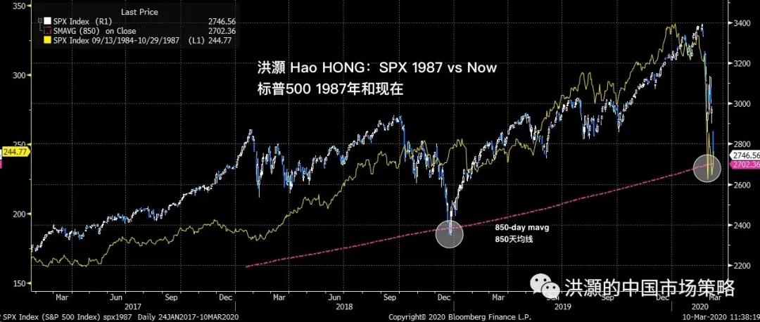 鉴于美国股市近期的剧烈波动,我们很难找到一个与当前这段时期完全可比的时期。在大约两周的时间里,美国市场从最长牛变成了最快熊。基于下跌的速度,我们比较1987年行情时发现,如今的市场和1987年在暴跌速度和在850天移动平均线附近找到支撑等方面都有很好的相似性。