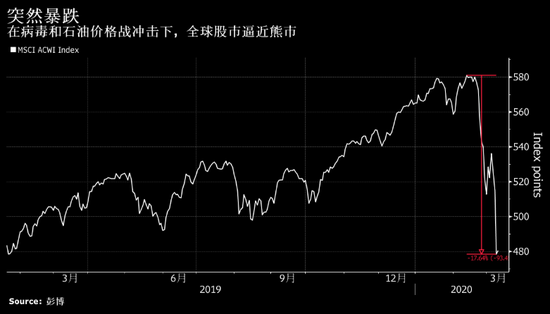 这些策略师称,全球股市可能会在反弹之前从峰值水平下跌20%至25%。由于对冠状病毒和石油价格战造成破坏的担忧使投资者抛售风险资产,截至周一,MSCI AC 全球指数较2月份的纪录高位下跌了18%。