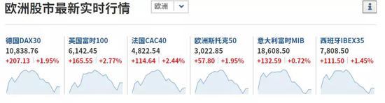 北京时间今天下午,欧洲股市大幅高开,截至北京时间21点05分,德国DAX30指数涨1.95%,英国富时100指数涨2.77%,法国CAC40指数涨2.44%。
