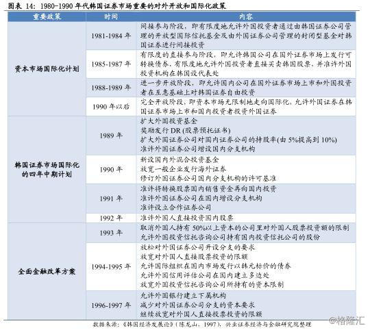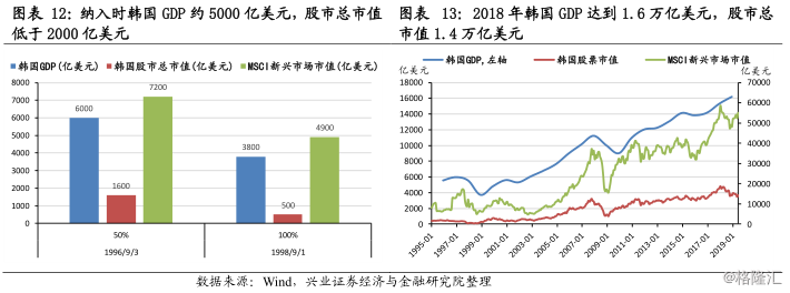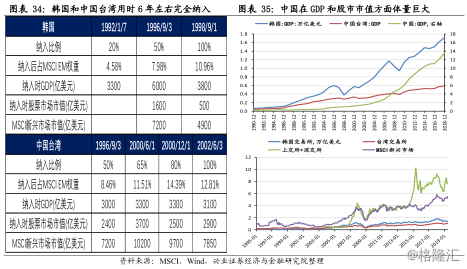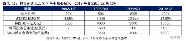 1) 1992年,韩国设立QFII制度,允许外资直接投资股票市场,持股比例限制为10%,韩国股市首次被纳入MSCI新兴市场指数,纳入比例为20%,纳入后占MSCI新兴市场指数权重为4.58%。