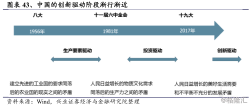 中国目前处在由投资驱动转向创新驱动发展阶段。新中国成立以来,我们在1956年-1981年(1978年),主要的经济驱动发展模式是生产要素驱动。从1981年-2017年,我们国家的主要经济驱动力是以地产、基建为代表的投资驱动。而这些时间点的变化,与我们社会主要矛盾的变化是基本一致和对应的,即从最开始的建设先进工业国到落后生产力再到不平衡不充分。那么站在当前这个时间点,面对新时代的转型需求,我们认为根据实际发展情况,我们在2017年以后,将逐步进行以创新驱动经济发展来弥补我们不平衡不充分发展的问题,逐步进入第三个经济发展阶段,即创新发展驱动。