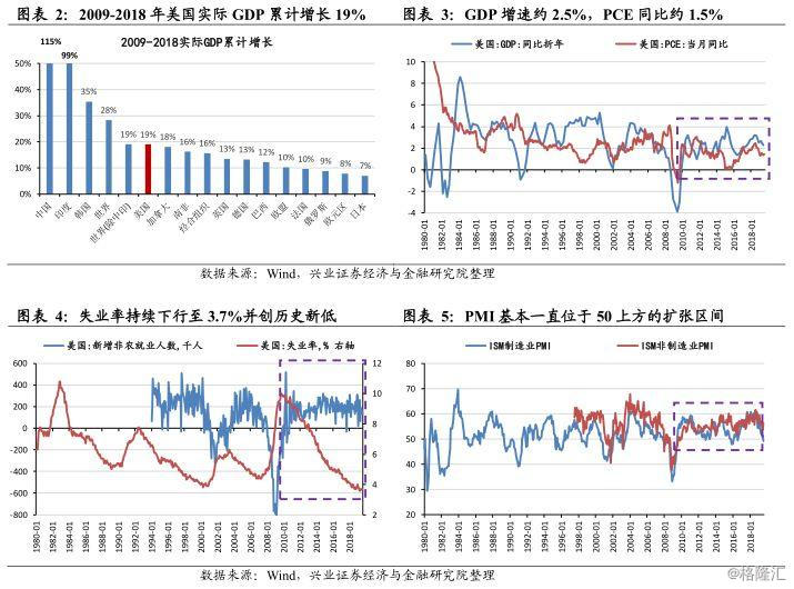 2009-2018的10年间,美国实际GDP累计增长接近20%,领跑主要经济体,仅落后中、印、韩。全球金融危机之后,美国宏观经济复苏的态势良好,GDP增速约2%,PCE同比处于1.5%左右的温和低通胀环境。每月新增非农就业人数保持在20万人附近的水平,失业率持续下行至3.7%并创历史新低,制造业和服务业PMI基本一直位于50上方的扩张区间。