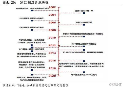2002年11月7日,证监会和央行联合发布《合格境外机构投资者境内证券投资管理暂行办法》,QFII制度正式出台,总额度初定为40亿美元。2011年12月16日,RQFII试点推出,初期仅限境内证券基金公司的香港子公司参与,试点总额度200亿元,投资股市不超过20%。随后逐渐提高额度、放宽限制,至2019年全面取消QFII和RQFII投资额度限制。