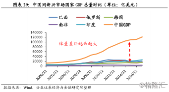 对标新兴市场国家,我国GDP总量远超过其他新兴市场国家,且体量差距愈来愈大。我国同其他新兴市场国家在起步上相似,起步较晚,且初始体量都很低。