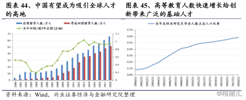 从索洛模型之人才(L)来看,中国逐步成为全球的人才高地。新技术研发需要高素质人才是必不可少的条件。而受益于国内经济成为全球第二大经济体和国内稳定的政治经济局面,使得海外高端人才逐步归国、千人计划的引领作用也越来越强大。同时,高等教育人数快速增长给创新带来广泛的基础人才,技术型人才不断涌入创新创业队伍,使得我国已经具备了创新发展所需要的人才基础。