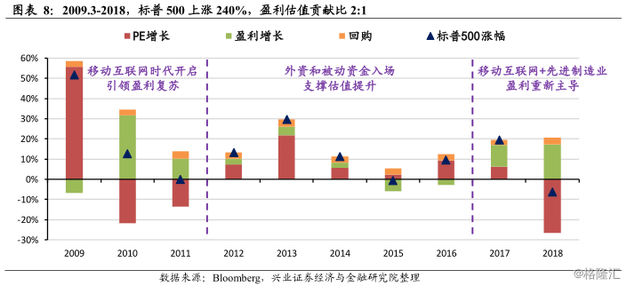 2009-2018年:移动互联网浪潮+先进制造业觉醒,外资和被动资金入场,盈利和估值交替推动美股10年间上涨240%。