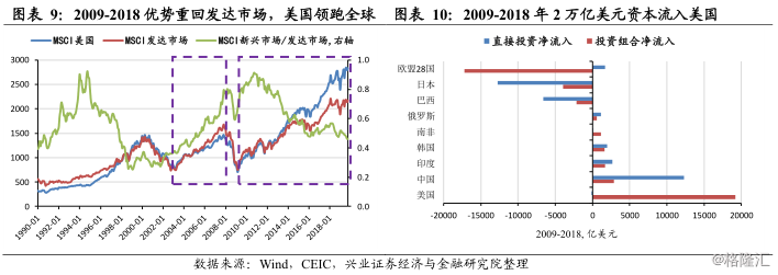 2009-2018年,金融危机以后,全球避险情绪高涨,美元指数走强,美国经济强势复苏,叠加iphone为代表的移动互联网和制造业两大潮流,助推全球资金回流美国。MSCI发达市场指数跑赢新兴市场指数,MSCI美国指数跑赢发达市场指数。全球资金从新兴市场转向发达市场,大部分集中流向美国,2009-2018年有2万亿美元资金净流入美国金融市场,8000亿外资进入美国股票市场。