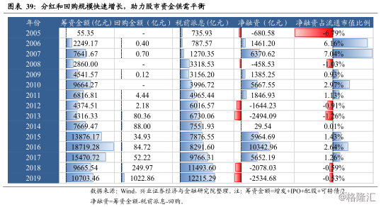 从股市资金供需来看,A股2018和2019年净融资额占流通市值的比例为-0.5%,考虑到未来回购和分红规模仍将快速增长,股市供需有望趋向良性循环。制度基础不断完善,注册制、再融资、回购制度和分红制度等多项改革同步推进,股市资金供需良性平衡格局将会极大助益A股走出长牛。