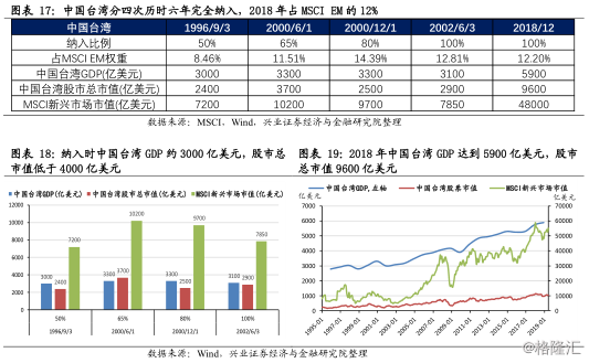 1996至2002年的六年时间内,中国台湾不断放开外资直接参与股票市场的限制,中国台湾股市被分四次完全纳入MSCI,2018年中国台湾占MSCI新兴市场指数的权重达到12.2%。中国台湾在1990年时就开启了QFII制度,但彼时QFII的设立和运行均受到诸多方面的限制。1996年起,中国台湾从QFII资格、QFII额度、市值权重限制、投资范围、外汇管制等方面,不断放开外资直接参与股票市场的限制。MSCI也在六年时间内,分四次将中国台湾股市完全纳入新兴市场指数。截至2018年12月,中国台湾占MSCI新兴市场指数权重的12.20%。此时中国台湾GDP达到5900亿美元,股票市场总市值9600亿美元。MSCI纳入中国台湾股市的关键节点为: