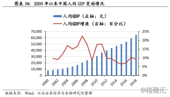 人均GDP增速惊人、增幅可观。同GDP总量发展历程类似,我国人均GDP自2000以来同样增长迅速,人均GDP变为初始的9倍,年均速达到13%,其中2000-2012年间均速达到15.6%,2012年以后增速有所放缓。
