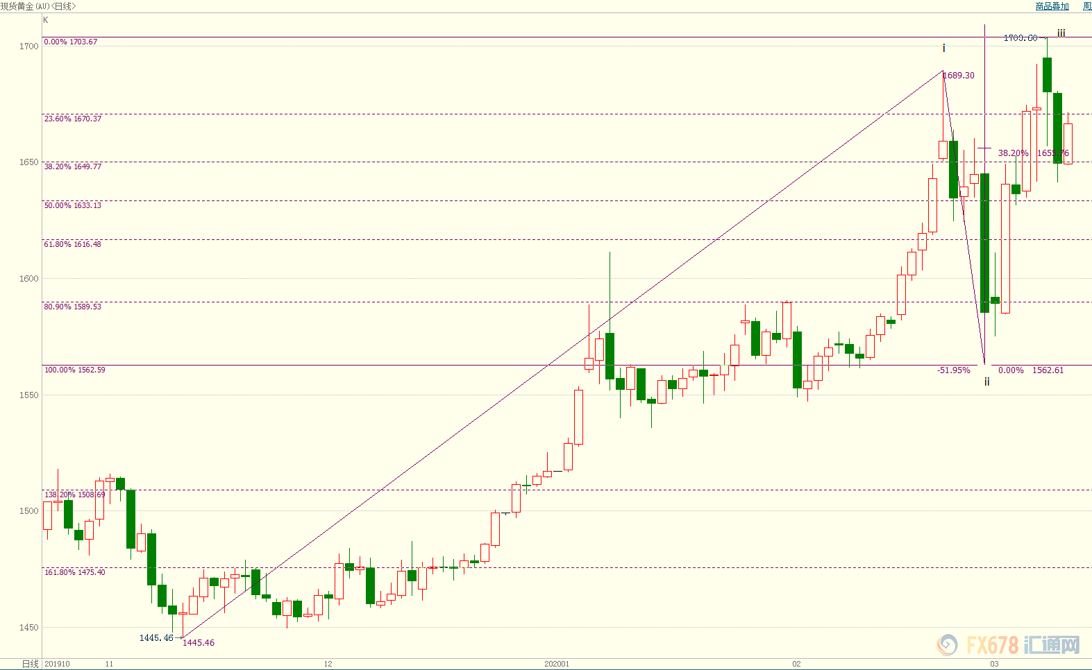 在1650美元获得支撑,并上破1670美元,它们分别是上行(i)浪(1563-1703美元区间)的38.2%和23.6%斐波那契回档位。